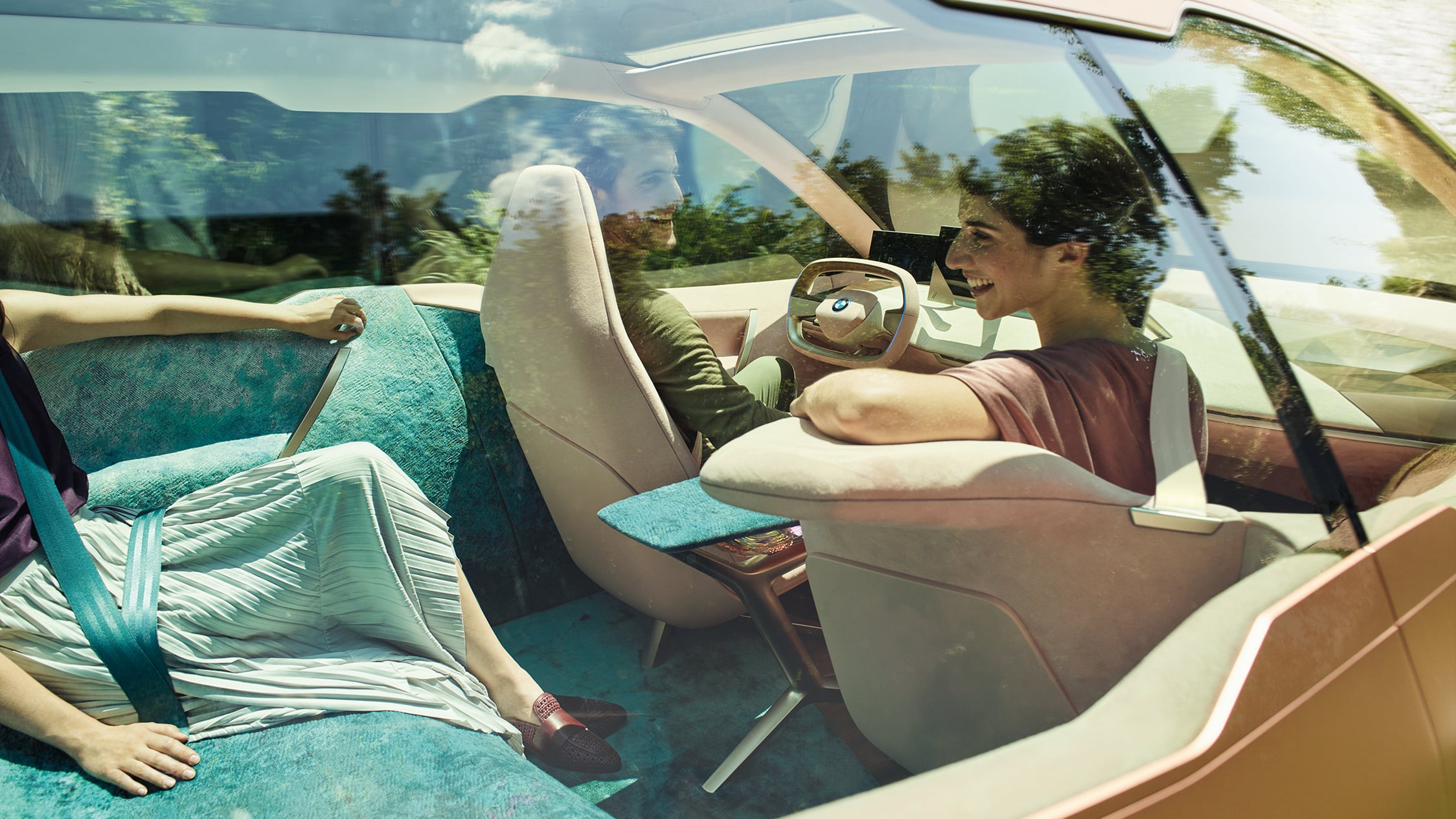 Imagine this: you’re sitting in a car with four other passengers, all seated in rotatable chairs facing each other as you would at a dinner table, chatting away while being driven to your destination. The vehicle stops, your smartphone pings to signal that you’ve arrived, and the chairs are automatically angled towards the doors, thus alighting effortlessly.